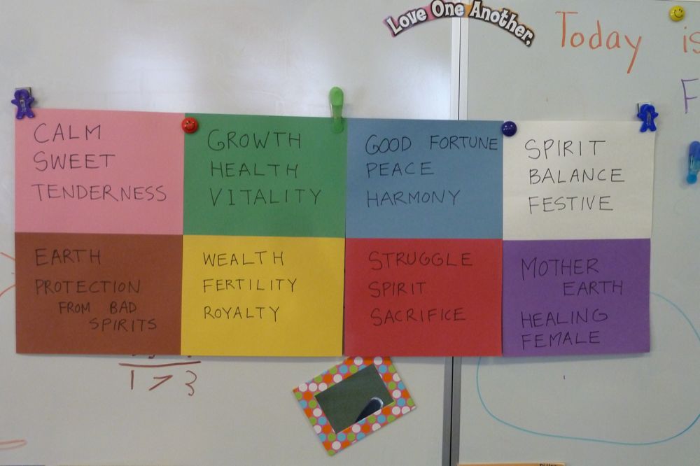 For art, we did "kente cloth" placemats. Kente cloth is a Central African specialty and uses strips of intricately woven cloth in bright colors. It is a ceremonial cloth and well known outside of Africa. Each color has a meaning.